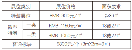 (2)特裝展位為室內光地,不帶任何設施,由參展企業自行或委托設計、裝修,并繳納施工管理費15元/㎡。每個特裝參展企業展出面積不得小于36平方米(附展位圖)。