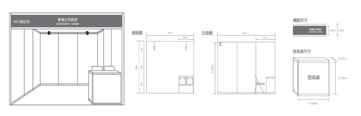 (4)普通標展搭建由組委會統一安排。展位內噴繪、裝飾由參企業自行負責。展位采用國際標準展架,鋁合金構架,三面展墻,楣板一塊,咨詢桌一張,椅子兩把,燈兩盞(上述設施需交納押金1000元)。用電企業可免費向展館申請220V普通電源 。普通標展雙開口需另加1500元/個。