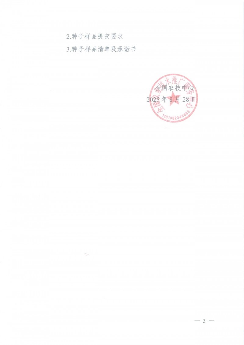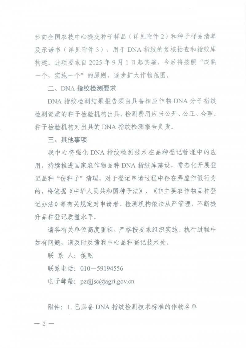 根據(jù)新修訂的《非主要農(nóng)作物品種登記辦法》第十三條規(guī)定,已具備DNA指紋檢測行業(yè)技術(shù)標準的作物(詳見附件1)申請登記前應當提交品種DNA指紋檢測報告。其中,已構(gòu)建國家農(nóng)作物品種DNA 指紋庫的作物(向日葵、黃瓜、甜瓜、番茄、西 瓜),檢測報告還應包含品種DNA指紋比對篩查結(jié)果,并在省級審查通過后,向國家農(nóng)作物品種標準樣品庫提交種子樣品,同步向全國農(nóng)技中心提交種子樣品(詳見附件2)和種子樣品清單及承諾書(詳見附件3),用于DNA 指紋的復核抽查和指紋庫構(gòu)建。此項要求自2025年9月1日起實施,今后將按照“成熟一個,實施一個”的原則,逐步擴大作物范圍。
