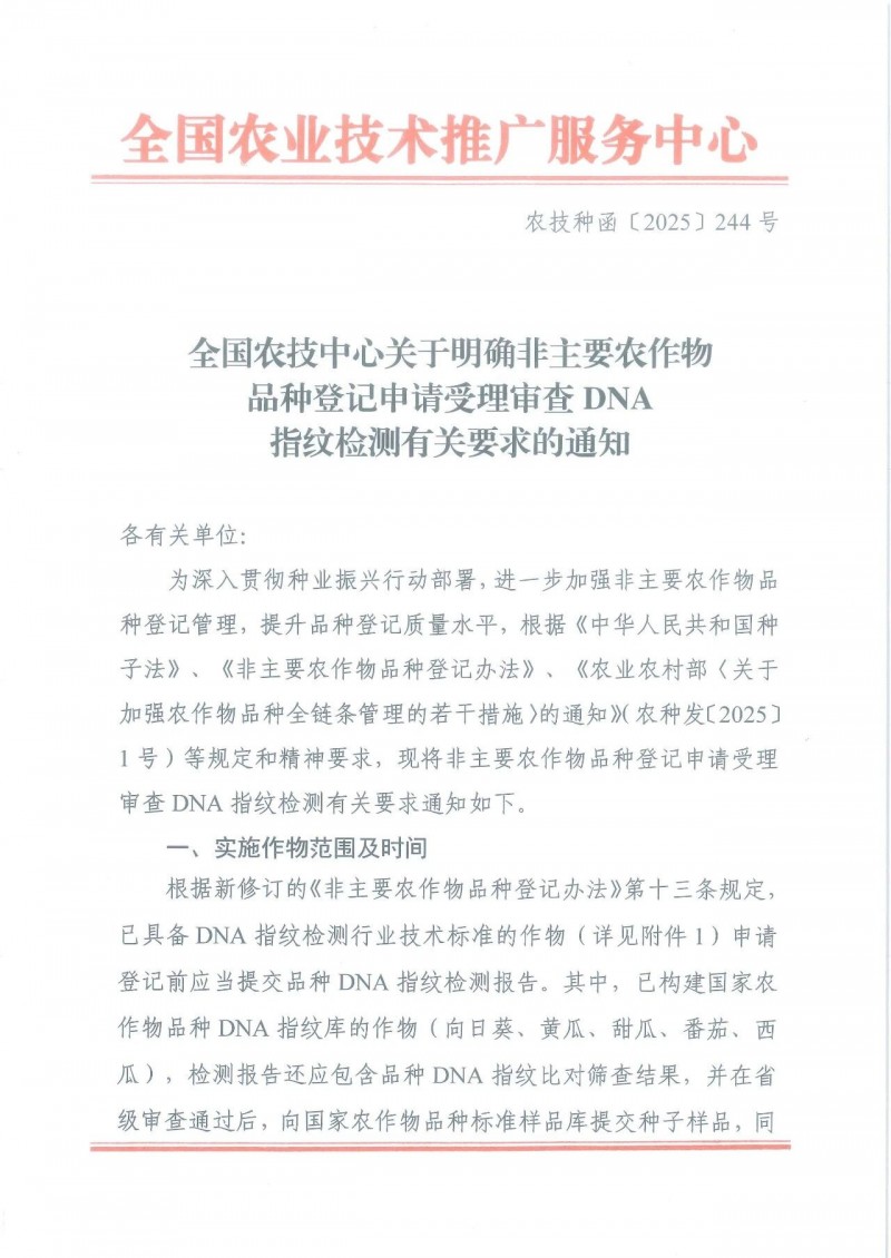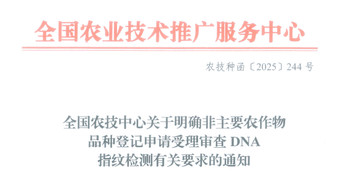 為深入貫徹種業(yè)振興行動部署,進一步加強非主要農(nóng)作物品種登記管理,提升品種登記質(zhì)量水平,根據(jù)《中華人民共和國種子法》、《非主要農(nóng)作物品種登記辦法》、《農(nóng)業(yè)農(nóng)村部〈關(guān)于加強農(nóng)作物品種全鏈條管理的若干措施〉的通知》(農(nóng)種發(fā)〔2025〕1號)等規(guī)定和精神要求,現(xiàn)將非主要農(nóng)作物品種登記申請受理審查 DNA 指紋檢測有關(guān)要求通知如下。