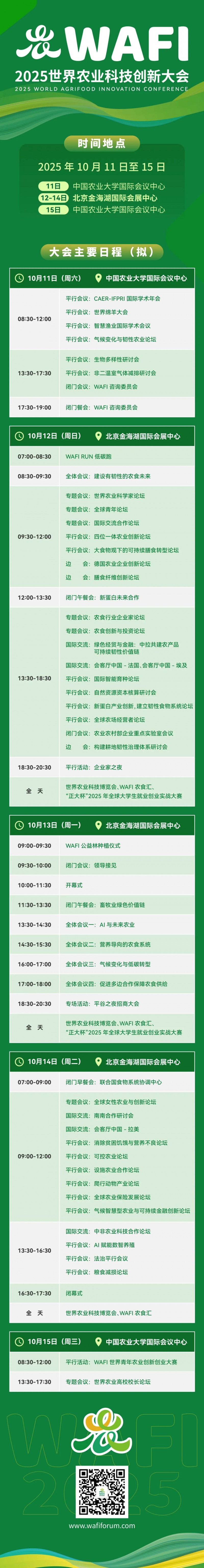 2025世界農業科技創新大會(英文縮寫:WAFI)將于10月12日—14日在平谷區金海湖國際會展中心、10月15日在中國農業大學舉辦。本次大會由中國農業大學、北京市農業農村局、北京市平谷區人民政府、國際農業研究磋商組織聯合主辦,以“踐行大食物觀,共建韌性食物供應體系”為主題,采用“1+7+1+N”總體架構,打造國際化、常態化、高規格的農業“達沃斯”。